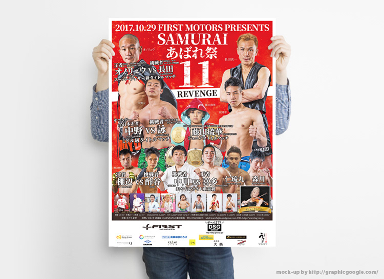 Samuraiあばれ祭さま:A1ポスター制作 北陸最大級の格闘技ビックイベントSamuraiあばれ祭さまよりクラウドソーシングでご縁をいただき制作させていただきました。おもしろそうな対戦カードに格闘技ファンの血をたぎらせながら作らせていただきました。